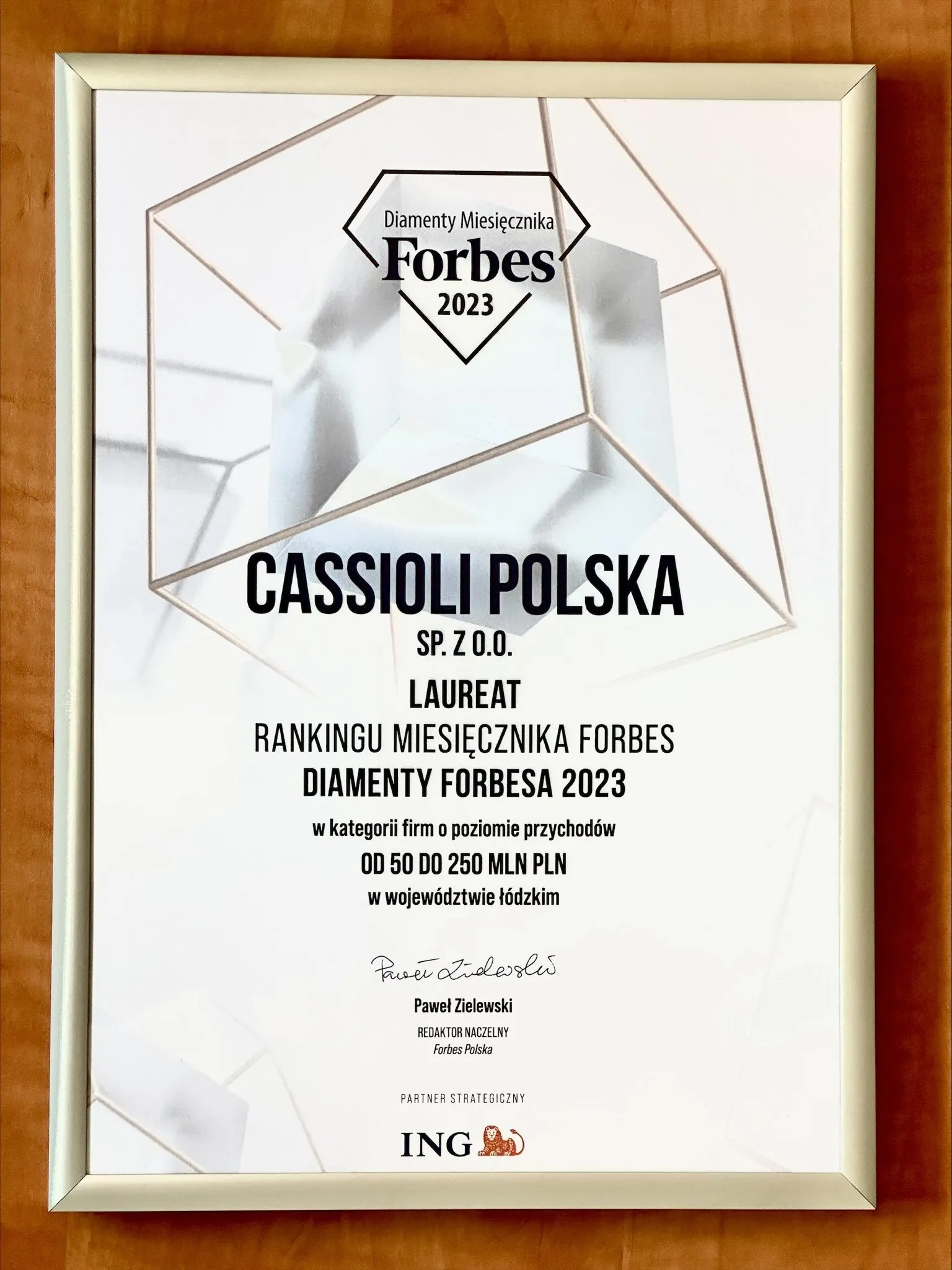 Estamos muy contentos de anunciar que Cassioli Polska ha sido galardonada con el «Forbes Diamond» por segundo año consecutivo, un importante reconocimiento que Forbes, en colaboración con ING Group, asigna cada año a las empresas del área de Łódź que destacan por su crecimiento y calidad.