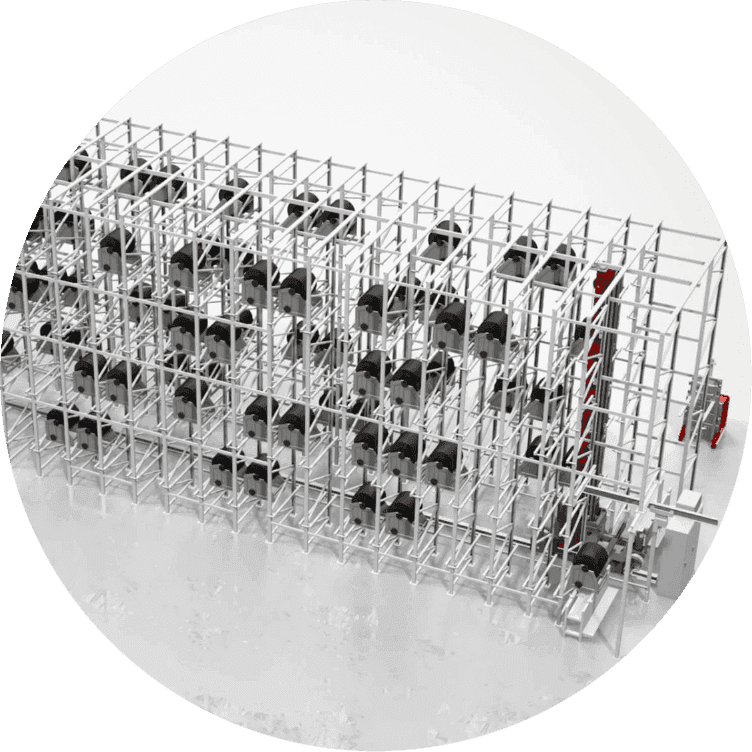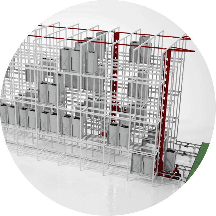 Os armazéns de moldes da Cassioli são armazéns automáticos para o armazenamento e recuperação de unidades compostas por moldes e outras partes (paredes laterais) colocadas em paletes metálicos. Estes armazéns estão equipados com uma ou mais empilhadeiras e um sistema de gestão que permite armazenar, organizar e retirar os moldes do armazém e transportá-los corretamente para a prensa de polimerização.