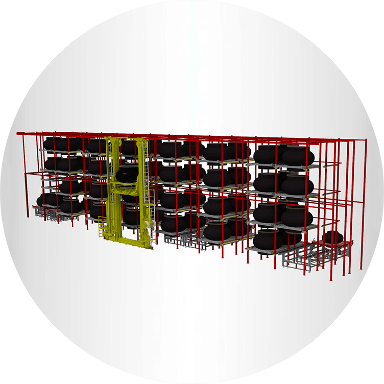 O armazém de Green Tire da Cassioli é um sistema totalmente personalizável, para que as unidades de armazenamento possam ser organizadas de acordo com as necessidades e pedidos específicos do cliente. As empilhadeiras podem mover até quatro pneus ao mesmo tempo, mas cada garfo é independente, por isso também podem operar com lotes individuais. Os altos potenciais de carga e manipulação, em comparação com os sistemas de armazenamento manuais, tornam estes sistemas indispensáveis em sistemas específicos industriais de produção de pneus.