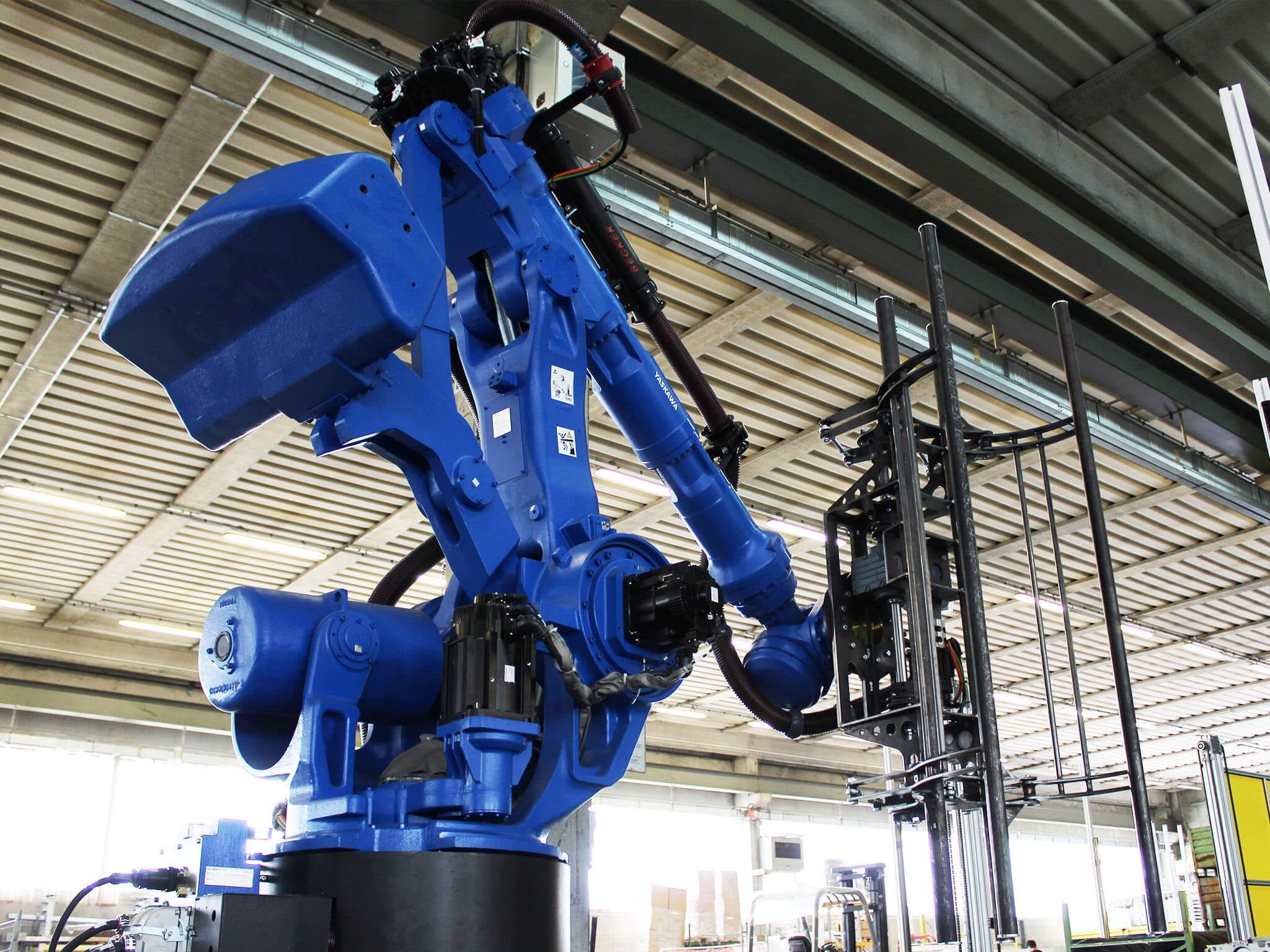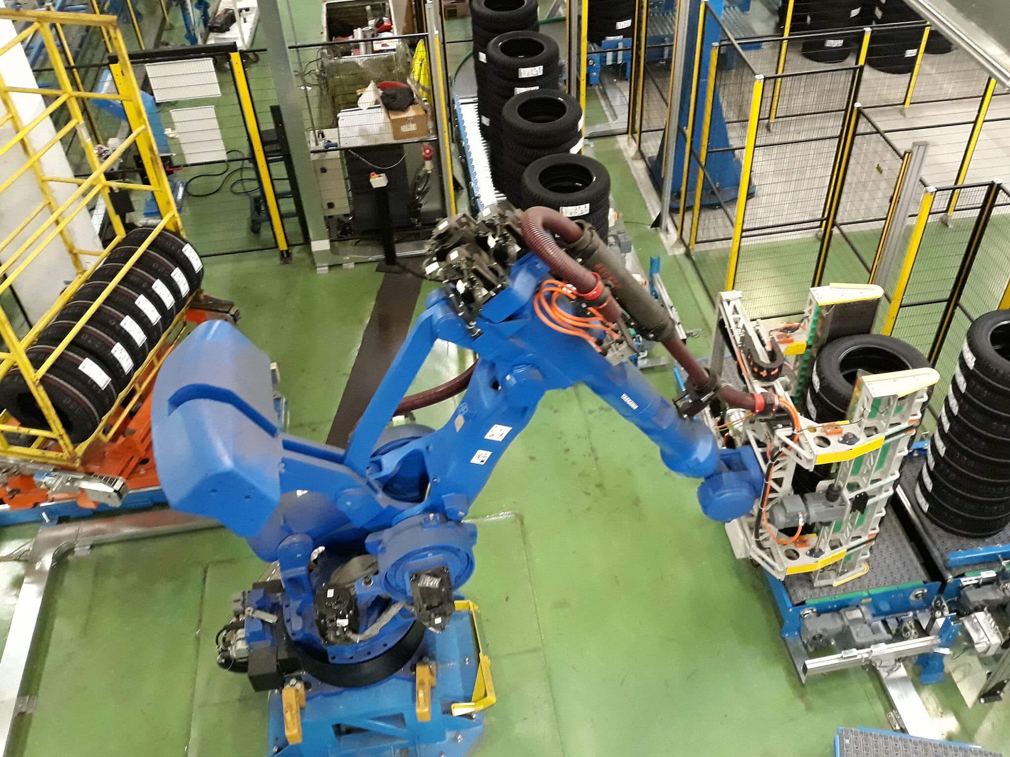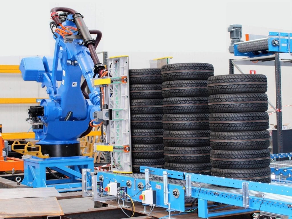 Os robôs paletizadores antropomórficos da Cassioli são o elemento central das células de paletização de pneus. Cada célula de paletização está equipada com um robô antropomórfico de 6 eixos capaz de carregar duas estações de palete, assim, enquanto o robô está carregando um palete, um operador pode retirar o outro palete completo e reposicionar um vazio.