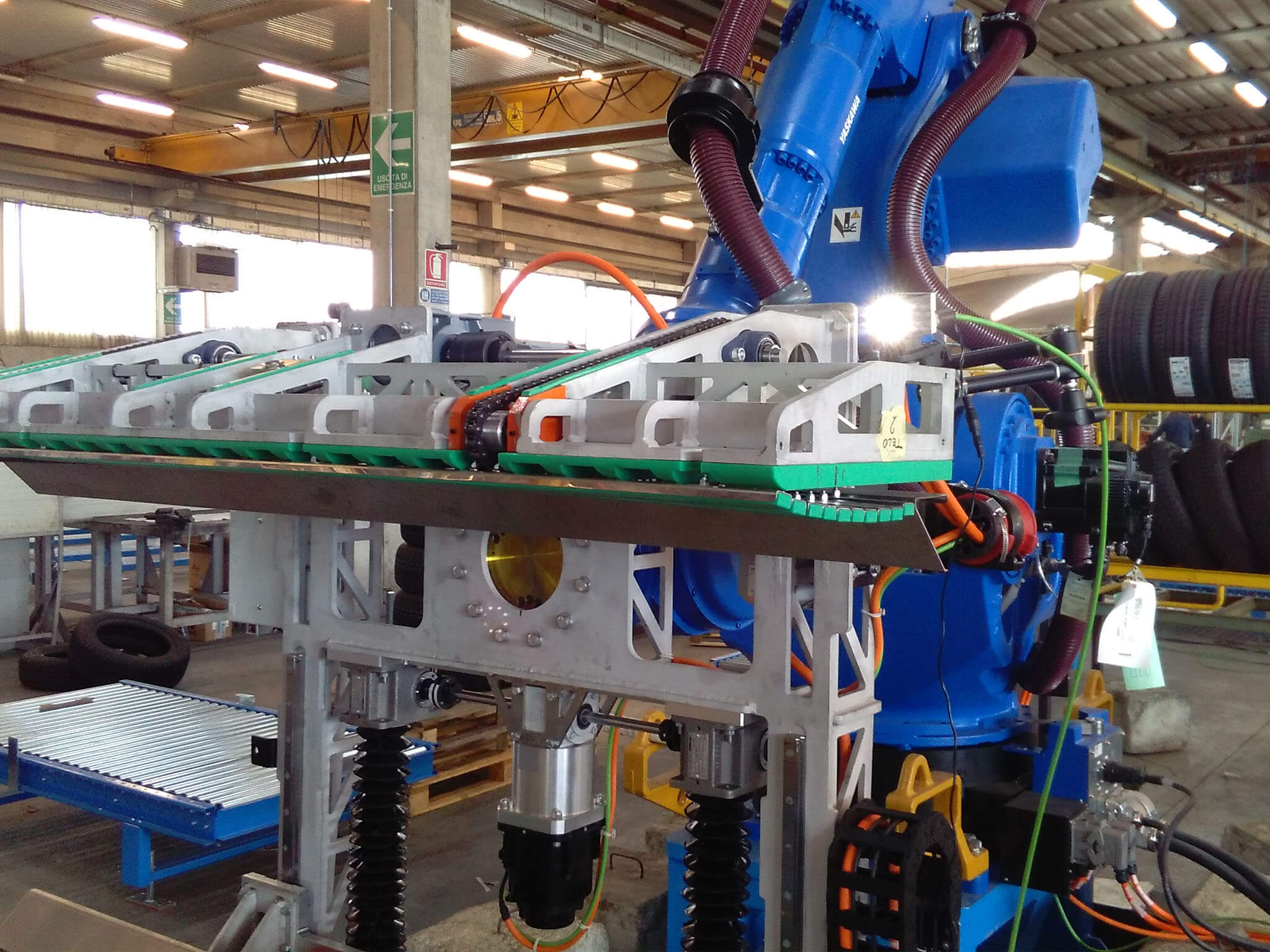 O robô está equipado com uma pinça dupla, por isso é capaz de recolher e posicionar dois pneus (do mesmo tipo) por ciclo.